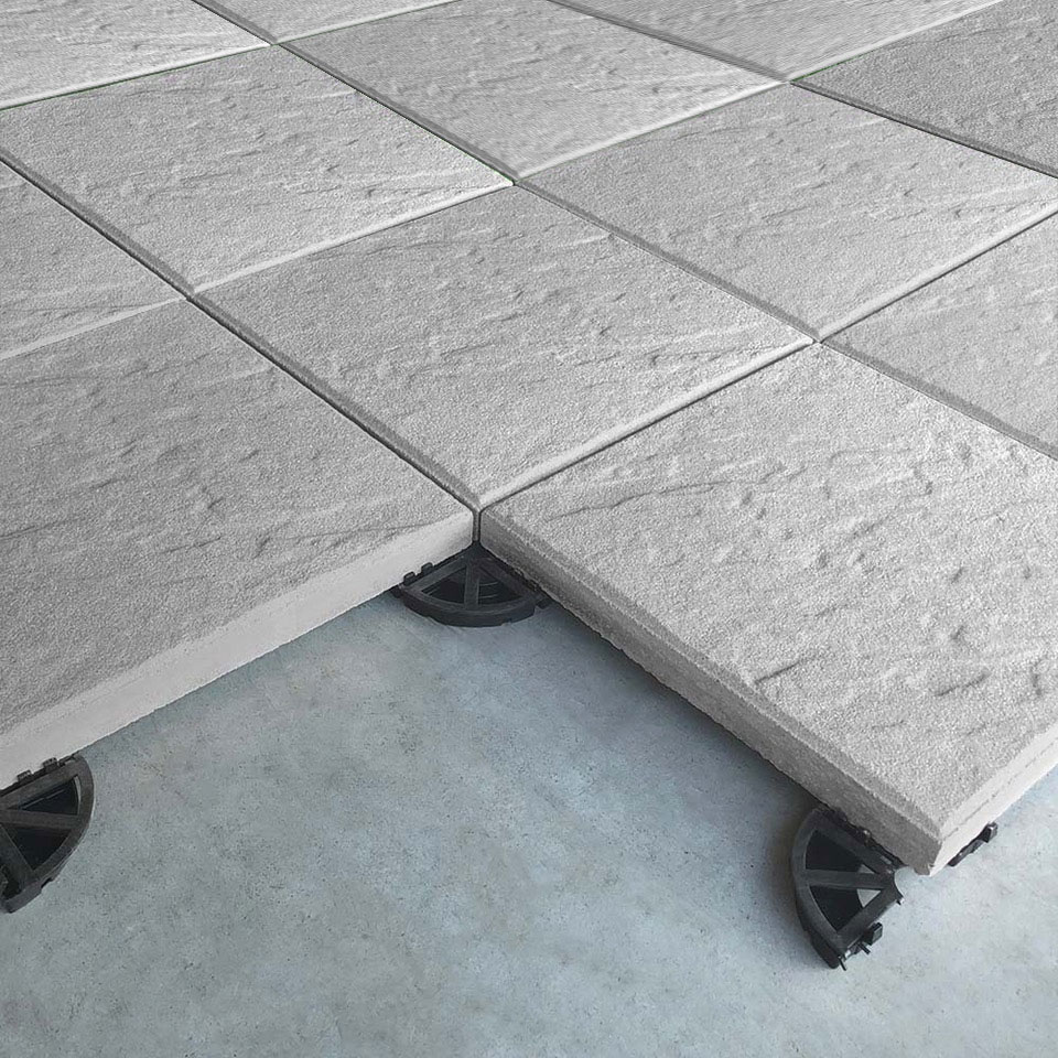 Supporto per quadrotti per il posizionamento di piastre in graniglia e cemento. Permette il deflusso e l’eliminazione delle acque piovane e il galleggiamento degli elementi del pavimento. Il livellatore compensa eventuali cambi di quota del sottofondo rendendo la superficie complanare.